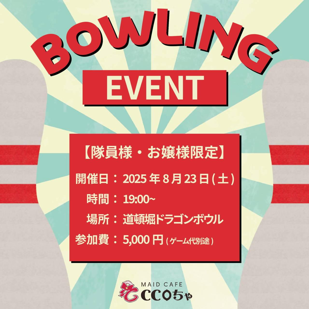 【ご主人様・お嬢様限定】ボーリング大会参加受付中! 2025/08/01 【隊員様・お嬢様限定】ボーリング大会参加受付中! 約3年ぶり?! 隊員様・お嬢様限定ボーリング大会を開催! 開催日:2025年8月23日(土) 時間:19:00~ 場所:道頓堀ドラゴンボウル 参加費:5,000円(ゲーム代別途) それに伴い現在CCOちゃ店頭にて参加受付を開始しております。 店頭にてメイドにお声がけくださいませ。 沢山のご参加お待ちしております!