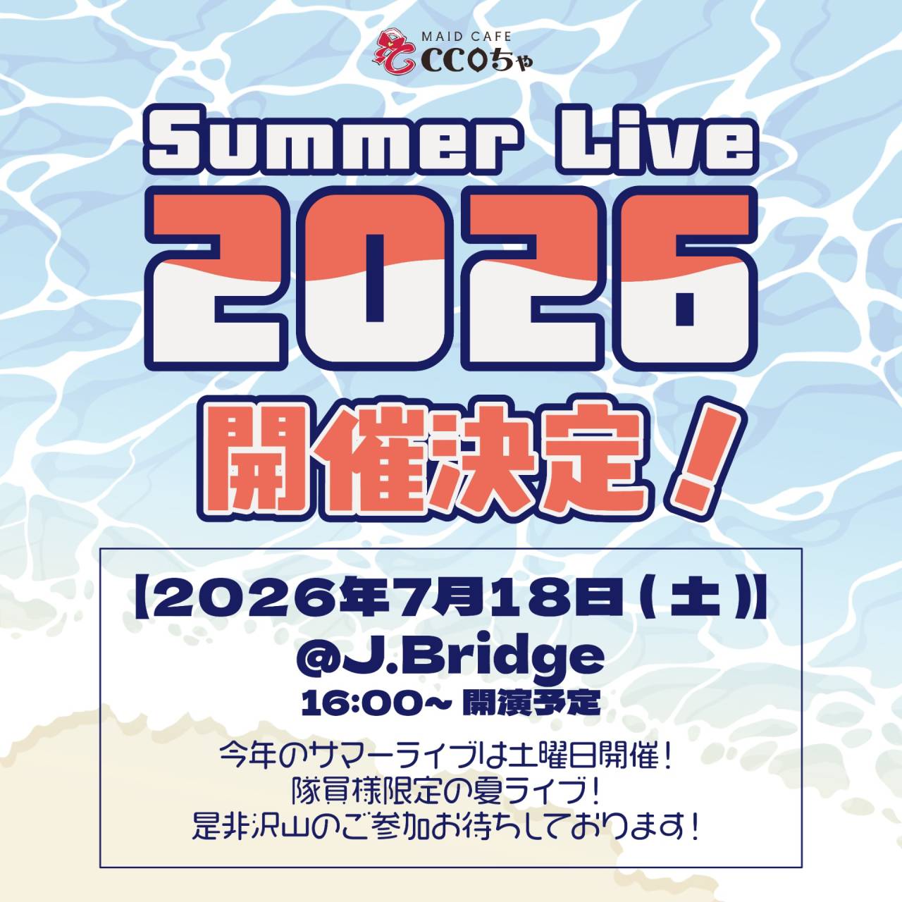 サマーライブ2026開催のお知らせ 2026/04/25 サマーライブ2026開催のお知らせ 今年も夏がやってくる! サマーライブ2026開催決定のお知らせです! 日時:2026年7月18日(土) 16:00~開演予定 会場:J.Bridge (大阪府大阪市浪速区日本橋4丁目11-2) 今年のサマーライブは土曜日開催! その他詳しい詳細は追ってお知らせいたします。 隊員様限定の大人気夏ライブとなっておりますので 是非沢山のご参加お待ちしております!